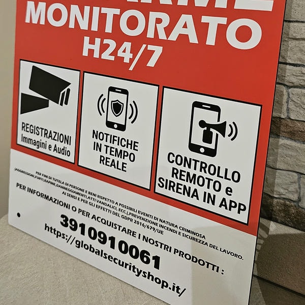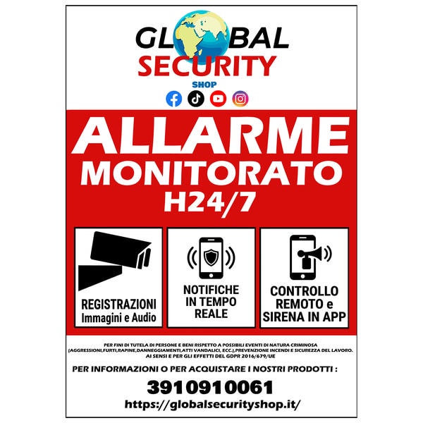 Global Security Shop, grazie ad anni di studi e analisi nel settore della sicurezza, ha sviluppato un cartello videosorveglianza altamente funzionale, progettato per aumentare l’effetto deterrente in modo concreto. Le informazioni riportate — come “allarme monitorato”, “notifiche in tempo reale” e “sirena attiva” — agiscono come veri e propri segnali di rischio per i malintenzionati, attivando una percezione immediata di controllo e intervento.