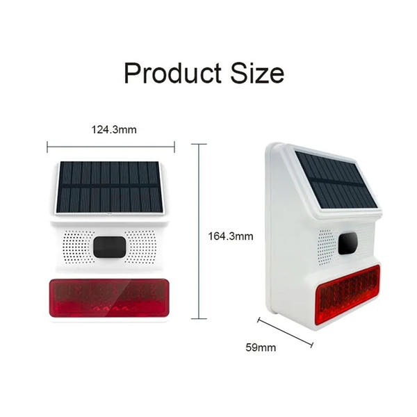 La Sirena da esterno con alimentazione solare wireless con strobo è un dispositivo elettronico necessario per segnalare a distanza qualsiasi tipo di allarme. Sirena wireless per esterno, munita di pannello solare e strobo emette suono d’allarme ≥ 90/95 dB. Dotata di sensore antimanomissione.