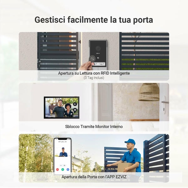 - Sblocco tramite App, monitor o Tag RFID MiFare 13.56MHz (3 tag inclusi);