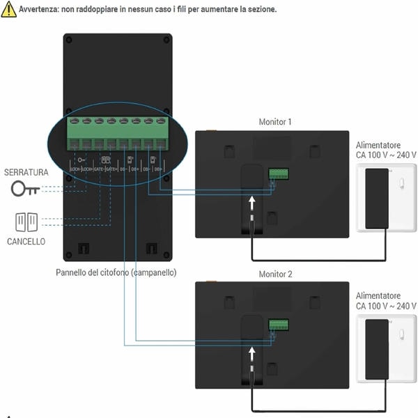 | Terminale | Due porte di cablaggio per collegare il primo citofono esterno. |